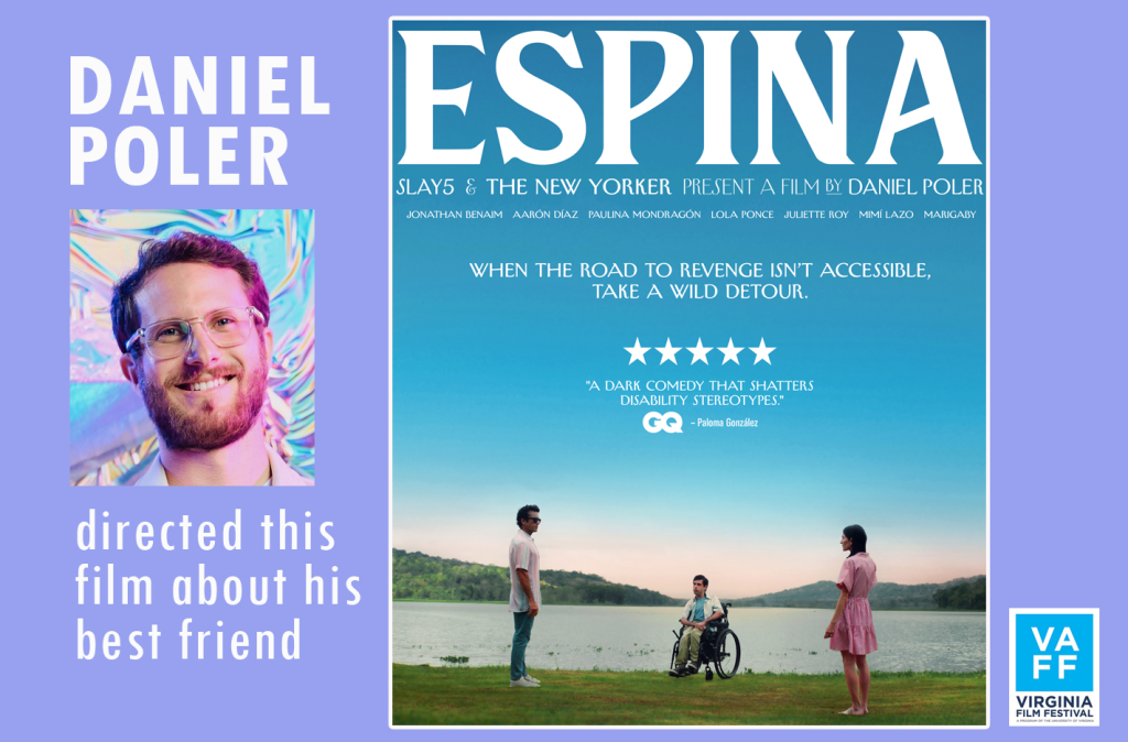 Daniel Poler comes from Venezuela and Panama and his new film is coming to this year’s Virginia Film Festival (10/22-26). ESPINA is the film he made about and starring his best friend, Jonathan, who’s confined to a wheelchair. The movie explores the subject with an upbeat attitude. We discuss: